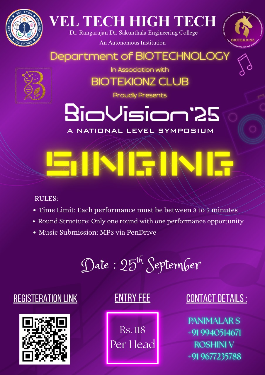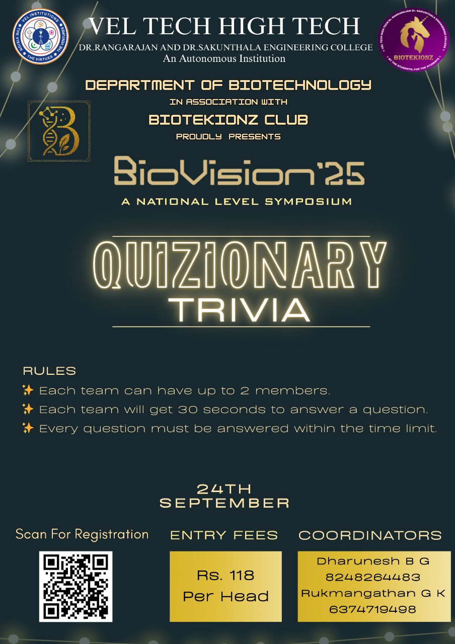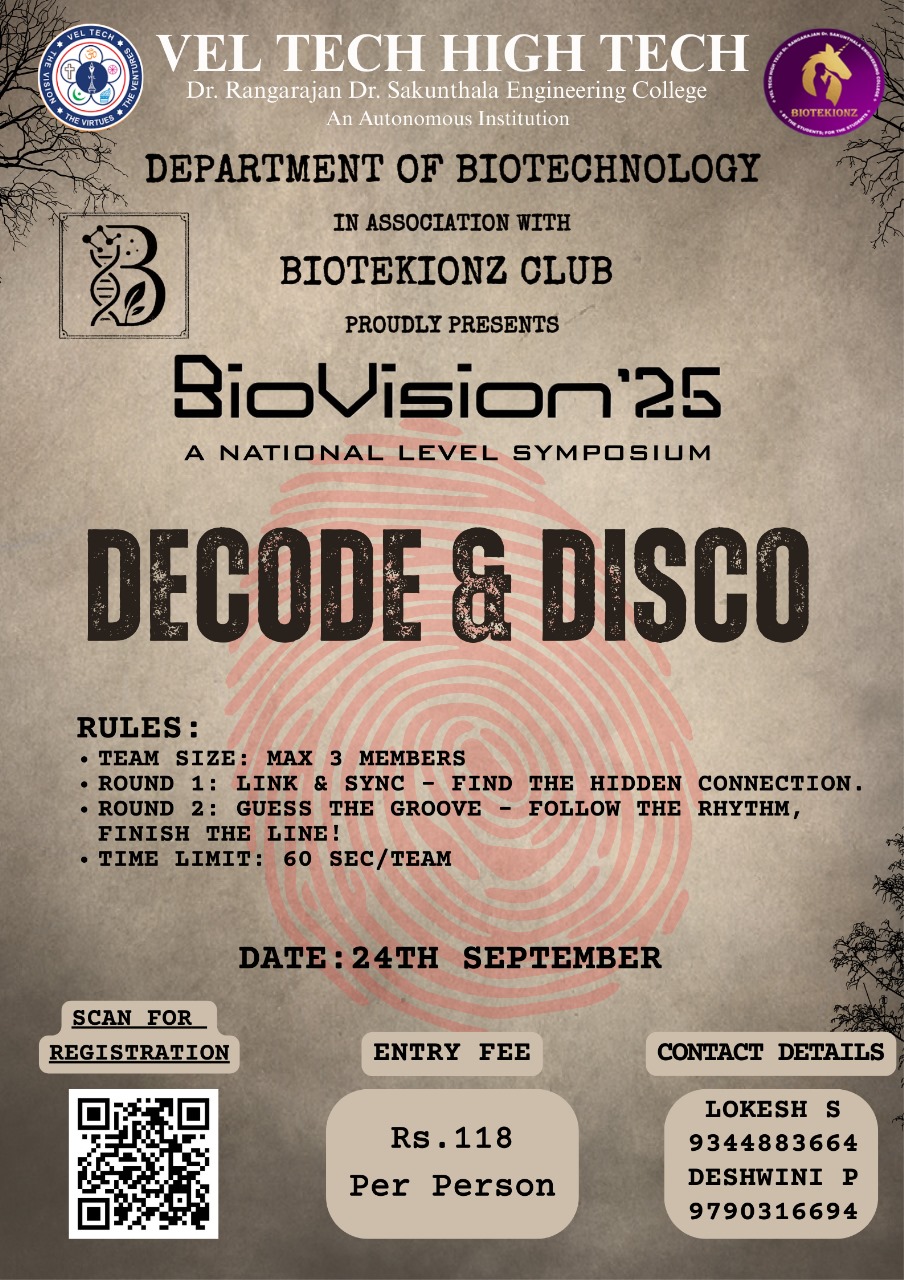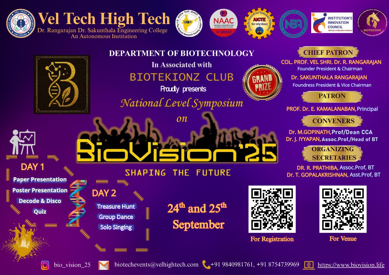 Biovision is a vibrant gathering of students driven by a passion for biotechnology. The symposium offers a space to discover new ideas, discuss breakthroughs, and engage with like-minded peers. The event encourages collaboration, creativity, and a forward-looking approach to science.The goal is to nurture curiosity and shape future innovators in the life sciences.