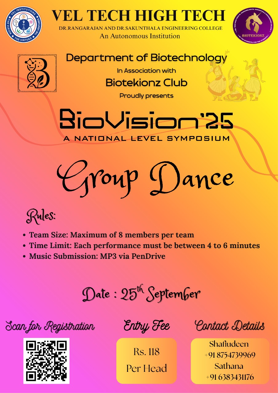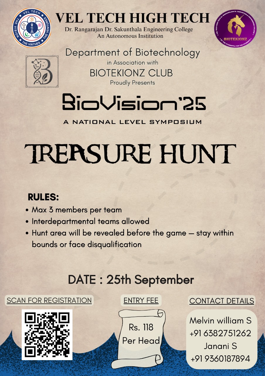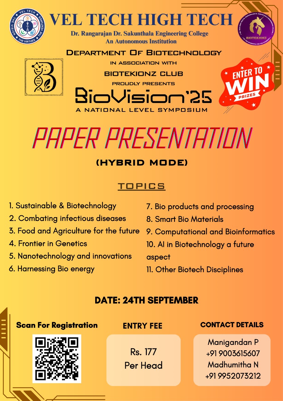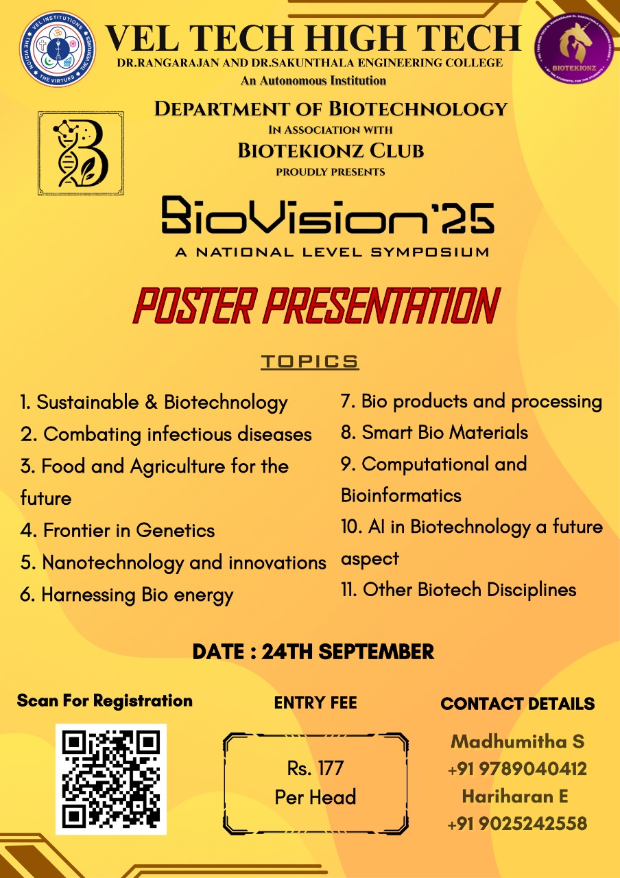 Biovision is a vibrant gathering of students driven by a passion for biotechnology. The symposium offers a space to discover new ideas, discuss breakthroughs, and engage with like-minded peers. The event encourages collaboration, creativity, and a forward-looking approach to science.The goal is to nurture curiosity and shape future innovators in the life sciences.